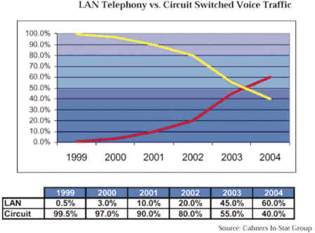 Group的資料顯示,LAN Telephone與Circuit Switched Voice Traffic比較圖,呈現(xiàn)數(shù)據(jù)網(wǎng)絡(luò)的占有率將在二至三年后,首度超越語音網(wǎng)絡(luò)的流量占有率。因此,不論是盤據(jù)傳統(tǒng)電信市場大廠如Lucent及Nortel,或是代表網(wǎng)絡(luò)新興勢(shì)力的Cisco,也都在積極爭搶這塊新領(lǐng)域的主導(dǎo)權(quán)。于是,有人說,「IP