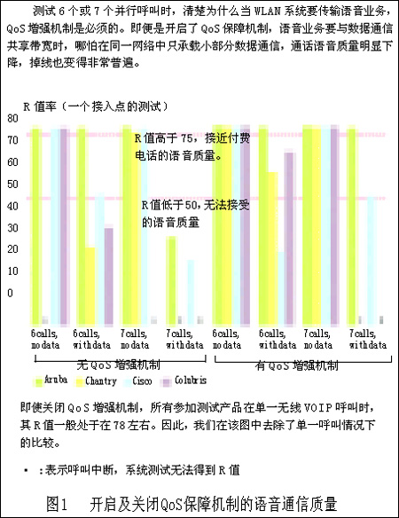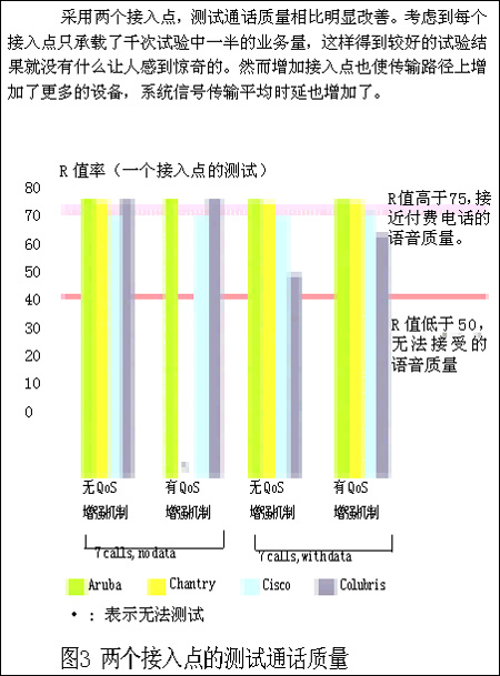 但我們這樣做是合理的。首先,Chantry和Colubris的設(shè)備甚至在建議內(nèi)的6個(gè)并行VoIP呼叫情況下,也無(wú)法正常通話。第二,Aruba的設(shè)備能夠處理7個(gè)并行VoIP呼叫并能適應(yīng)加入數(shù)據(jù)流業(yè)務(wù)的情況。第三,我們最有難度的試驗(yàn)也遠(yuǎn)低于無(wú)線傳輸媒介的最大負(fù)載。我們?cè)囼?yàn)通常低于3Mbps的通信傳輸速度(包括試驗(yàn)中的所有語(yǔ)音和數(shù)據(jù)業(yè)務(wù)),更遠(yuǎn)低于無(wú)線信道的容量了?傊,VoWLAN系統(tǒng)可以實(shí)現(xiàn)在單接入點(diǎn)承載7個(gè)并行VoIP呼叫并加入數(shù)據(jù)通信業(yè)務(wù),但要做到這一點(diǎn)需要更完善的系統(tǒng)設(shè)計(jì)和產(chǎn)品性能。