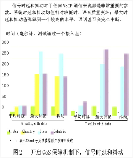 而當(dāng)我們通過一個(gè)接入點(diǎn)或交換機(jī)傳送6到7個(gè)并行VoIP呼叫時(shí),尤其是加入了數(shù)據(jù)通信業(yè)務(wù)后,所有產(chǎn)品的系統(tǒng)性能顯著降低。另外,當(dāng)開通7個(gè)并行VoIP呼叫和關(guān)閉QoS保障機(jī)制時(shí),即使沒有加入數(shù)據(jù)業(yè)務(wù), Colubris設(shè)備也幾乎都處于通話中斷的狀態(tài)。因此,我們無(wú)法得到任何測(cè)試數(shù)據(jù)(如圖1所示)。