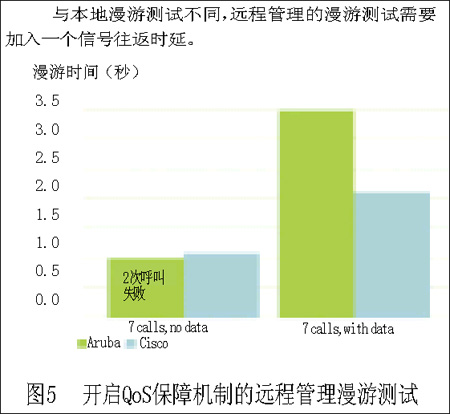 Aruba公司的設(shè)備在漫游測(cè)試中表現(xiàn)出色,它的平均漫游切換時(shí)間在0.5~1秒之間,雖然這已經(jīng)是所有的測(cè)試設(shè)備中表現(xiàn)最好的,但是通話者還是能夠察覺這種時(shí)延。而Cisco公司的設(shè)備,由于時(shí)間的限制,我們只進(jìn)行了7個(gè)并行呼叫的漫游測(cè)試,平均漫游時(shí)間為0.433秒到1.053秒,而加入數(shù)據(jù)流業(yè)務(wù)時(shí),在7個(gè)并行VoIP呼叫時(shí),系統(tǒng)的時(shí)延達(dá)到了4.324秒。