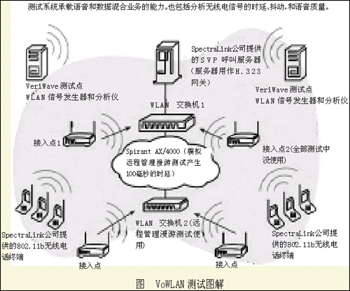 這次試驗(yàn)搭建了有著自己鮮明特點(diǎn)的VoWLAN試驗(yàn)系統(tǒng)。該系統(tǒng)包括兩個(gè)802.11b接入點(diǎn)適配設(shè)備和一部連接到接入點(diǎn)的交換機(jī)以及路由設(shè)備,還有14個(gè)WLAN手持終端設(shè)備和SpectraLink公司提供的SVP呼叫服務(wù)器(服務(wù)器用做H.323網(wǎng)關(guān))。另外,VeriWave公司提供了實(shí)驗(yàn)的測(cè)試設(shè)備。我們還在漫游測(cè)試項(xiàng)目中使用了由Spirent公司提供的信號(hào)損傷發(fā)生器。