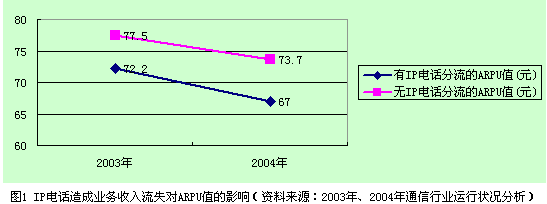 IP電話使ARPU值降低。2003年和2004年全國電信業(yè)務收入及電話用戶總數(shù)分別為4610億元、53199.8萬戶和5205億元、64726.7萬戶,平均ARPU值2003年為72.2元,2004年為67元。通過分析計算,由于IP電話造成的業(yè)務收入流失使2003年的平均ARPU值降低了5.3元,