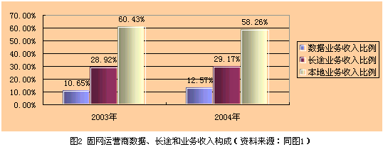 目前數(shù)據(jù)業(yè)務收入與話音業(yè)務收入相差懸殊,通過發(fā)展數(shù)據(jù)業(yè)務彌補VoIP造成的話音收入損失尚需時日。以固網(wǎng)運營商為例,2003年和2004年數(shù)據(jù)業(yè)務、長途業(yè)務和本地業(yè)務收入構(gòu)成見圖2所示。