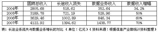 表1 長途業(yè)務流失與數(shù)據(jù)業(yè)務增長的對比 (單位:億元)(資料來源:根據(jù)信息產(chǎn)業(yè)部統(tǒng)計資料整理)