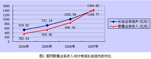 表1顯示,固網(wǎng)運營商的數(shù)據(jù)業(yè)務收入在年均增長10%的情況下,到2007年數(shù)據(jù)業(yè)務收入才能抵消由IP電話造成的長途業(yè)務收入的流失,具體情況見圖3所示。