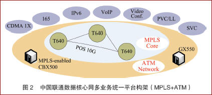 中國聯(lián)通IP電話網(wǎng)的承載網(wǎng)分為核心層和區(qū)域?qū)觾杉壗Y(jié)構(gòu),核心層由北京、上海、廣州、沈陽、武漢、西安和成都7個大區(qū)節(jié)點組成;區(qū)域?qū)影锤鞣止緟^(qū)域分布情況,劃分為22個區(qū)域。建網(wǎng)初期,承載網(wǎng)采用ATM+IP/VPN組成IP電話專用傳輸網(wǎng),確保IP承載層的QoS,網(wǎng)絡(luò)性能符合聯(lián)通測試指標(biāo)。下一階段,中國聯(lián)通數(shù)據(jù)核心網(wǎng)的技術(shù)演進(jìn)路線方向如圖2所示。網(wǎng)絡(luò)將以MPLS+ATM為核心技術(shù),在7大核心節(jié)點建設(shè)功能強(qiáng)大的MPLS核心網(wǎng)絡(luò),同時采用2層MPLS技術(shù),實現(xiàn)與ATM設(shè)備的透明連接,從而構(gòu)建一個多協(xié)議、多業(yè)務(wù)同時兼顧IPv4/IPv6發(fā)展的先進(jìn)網(wǎng)絡(luò)。中國聯(lián)通的互聯(lián)網(wǎng)、數(shù)據(jù)專線、IP電話、視頻會議、IPv6網(wǎng)絡(luò)、CDMA1X數(shù)據(jù)通信網(wǎng)等都承載在統(tǒng)一的數(shù)據(jù)傳送平臺之上。