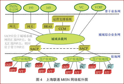 上海聯(lián)通MISN由5個部分組成(見圖4):(1)業(yè)務(wù)接入控制設(shè)備(SACP)。從用戶駐地網(wǎng)到城域網(wǎng)和骨務(wù)都必須通過SACP接的接入認(rèn)證、業(yè)務(wù)接入控制、網(wǎng)絡(luò)資源管理和服務(wù)質(zhì)量控制等。(2)呼叫管理控制模塊(CCM)。該模塊負(fù)責(zé)對用戶注冊的管理;通過SACP對業(yè)務(wù)接入進(jìn)行認(rèn)證和控制;與骨干業(yè)務(wù)網(wǎng)GK互通,完成各種業(yè)務(wù)的呼叫控制;與SACP一起采集計費信息;負(fù)責(zé)控制語音和視頻媒體流的接入。(3)業(yè)務(wù)網(wǎng)關(guān)。聯(lián)通MISN是基于IP的分組網(wǎng),與基于電路交換的193長途電話骨干網(wǎng)和本地PSTN市話網(wǎng)互通時,由于媒體層面和控制信令層面都不同,因此,需要通過網(wǎng)關(guān)進(jìn)行互通。(4)BRAS設(shè)備。負(fù)責(zé)將互聯(lián)網(wǎng)接入到165網(wǎng)。(5)業(yè)務(wù)運營支撐系統(tǒng)。該系統(tǒng)包括維護(hù)網(wǎng)管系統(tǒng)、用戶終端管理系統(tǒng)、用戶管理(業(yè)務(wù)受理、用戶信息管理、用戶業(yè)務(wù)授權(quán)與認(rèn)證)以及本地MISN的計費/營賬系統(tǒng),其對上的接口是各骨干業(yè)務(wù)網(wǎng)的運維支撐系統(tǒng)。