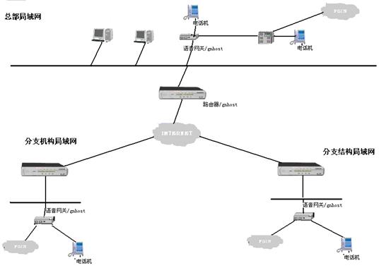 首先將VOIP電話網(wǎng)關(guān)的網(wǎng)絡(luò)接口接入到公司和分部(分公司)的局域網(wǎng)中,通過(guò)ADSL、ISDN、撥號(hào)上網(wǎng)等方式,同連接在此因特網(wǎng)上的其它VOIP電話網(wǎng)關(guān)相連,從而將不同地域的電話連接在一起,組成整個(gè)公司的IP電話網(wǎng),如果總部或分部有用戶程控交換機(jī),還可以將VOIP電話網(wǎng)關(guān)接入程控交換機(jī),使得整個(gè)交換機(jī)的分機(jī)都能利用IP網(wǎng)絡(luò)撥打免費(fèi)電話。如果這個(gè)VOIP設(shè)備具有PBX的功能。那么電話網(wǎng)關(guān)的多種接口還可以與電信(PSTN)相連,從而將專(zhuān)網(wǎng)的IP電話語(yǔ)音網(wǎng)與整個(gè)公網(wǎng)銜接成一個(gè)大的電話網(wǎng)絡(luò)。