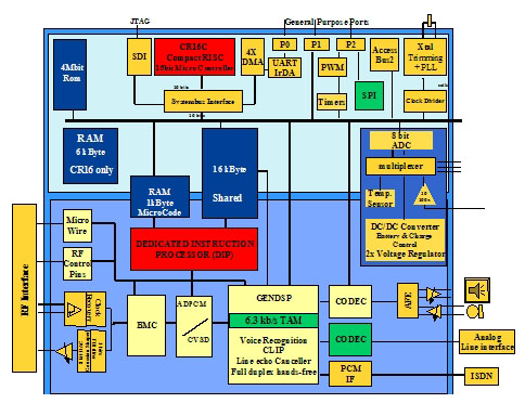 例如,SC14438是一個(gè)優(yōu)化了的CMOS芯片,能夠進(jìn)行DECT(1.9GHz)內(nèi)或2.4GHz ISM數(shù)字頻帶手機(jī)內(nèi)需要的所有音頻、信號(hào)及數(shù)據(jù)處理。一個(gè)ADPCM代碼轉(zhuǎn)換器,一個(gè)低功耗的編解碼器(CODEC)及模擬前端被集成于該芯片中,提供麥克風(fēng)與(動(dòng)態(tài)的)揚(yáng)聲器之間直接的連接。同時(shí)還整合了雙工免提操作。SC14438的設(shè)計(jì)適用于任一無線產(chǎn)品設(shè)計(jì)。一個(gè)專用的TDMA控制器能夠處理所有的物理層時(shí)隙和無線控制。美國國家半導(dǎo)體公司的標(biāo)準(zhǔn)小型RISC