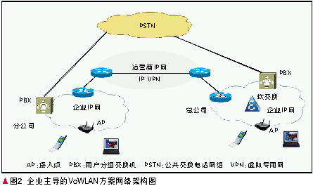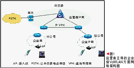 運營商將企業(yè)的總部及其各分支機構(gòu)的企業(yè)網(wǎng)接入自己的電信網(wǎng),通過IP 虛擬專用網(wǎng)(VPN)等技術(shù)將其組建成內(nèi)部互聯(lián)網(wǎng)(Intranet)。運營商為企業(yè)提供的VoIP業(yè)務(wù),目前一般是基于軟交換系統(tǒng)的。在企業(yè)中,WLAN手機和筆記本等WLAN終端通過企業(yè)的WLAN
