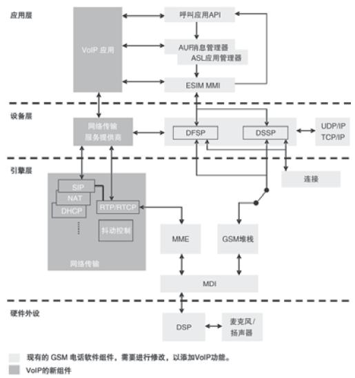 藍(lán)色方塊表示現(xiàn)有平臺(tái)的新應(yīng)用,包括網(wǎng)絡(luò)傳輸協(xié)議、核心控制VoIP應(yīng)用。由于支持GPRS功能的每部移動(dòng)電話(huà)都應(yīng)該帶有TCP/UDP