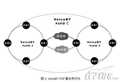 純P2P是采用分布式信息共享技術(shù)實(shí)現(xiàn)的無服務(wù)器網(wǎng)絡(luò)體系結(jié)構(gòu),VoiceBT P2P群是一個(gè)采用純P2P技術(shù)并由所有callfreee設(shè)備自發(fā)組成的智能P2P網(wǎng)絡(luò),電話線交互IP定位信息技術(shù)不但可以使網(wǎng)絡(luò)不需要服務(wù)器而且能夠極大的加快網(wǎng)絡(luò)收斂速度和增強(qiáng)網(wǎng)絡(luò)穩(wěn)定性。VoiceBT P2P群基本行為分為合并和查詢兩種。本文用圖例的方式簡要的介紹一下這兩種行為。