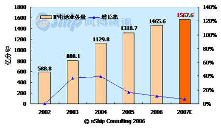 從圖中可以看出,國(guó)內(nèi)IP電話市場(chǎng)近年呈現(xiàn)出快速增長(zhǎng)趨勢(shì),2002-2007年年均增長(zhǎng)率為20.7%。預(yù)計(jì)2007年IP電話的通話時(shí)長(zhǎng)將達(dá)到1567.6億分鐘,同比增長(zhǎng)7%。但從2005年開(kāi)始,IP電話的增長(zhǎng)率呈下降趨勢(shì),這主要是受管制限制和移動(dòng)長(zhǎng)途的替代作用所致。