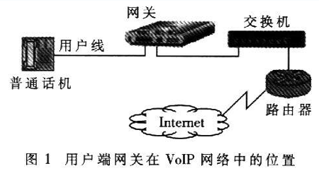近年來隨著寬帶網(wǎng)絡(luò)和IP技術(shù)的日益發(fā)展,VoIP>(Volee over Internet Protoc01)技術(shù)的應(yīng)用越來越廣泛。網(wǎng)關(guān)是VoIP網(wǎng)絡(luò)中的重要設(shè)備,按照應(yīng)用領(lǐng)域可分為電信級網(wǎng)關(guān)和用戶端網(wǎng)關(guān)。用戶端網(wǎng)關(guān)設(shè)備主要應(yīng)用于小區(qū)和企業(yè),是連接終端電話和IP網(wǎng)絡(luò)的橋梁,主要功能是進(jìn)行語音編解碼、信令處理、VoIP協(xié)議處理和路由協(xié)議處理等。用戶端網(wǎng)關(guān)設(shè)備在VoIP網(wǎng)絡(luò)中的位置如圖1所示?梢钥闯觯W(wǎng)關(guān)處于用戶電話線路部分的末端、IP網(wǎng)絡(luò)部分的起始端。