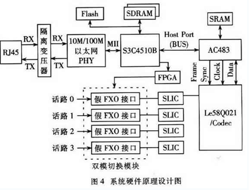 本節(jié)提出了一種基于H.323的雙模網(wǎng)關(guān)的系統(tǒng)設(shè)計方案,該方案支持4路話音,使用一種經(jīng)濟(jì)實用的“假FXO接口”方式實現(xiàn)雙模切換,能夠在VoIP通話時檢測到PSTN線上進(jìn)來的呼叫并可通過按話機(jī)的拍簧或者Flash閃斷鍵切換接聽!