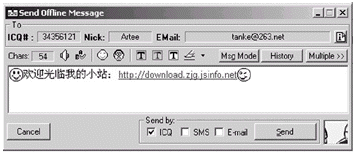 熱線聯(lián)系 即使ICQ界面最小化,一個顯示選中好友昵稱的小按鈕依然會保持在所有窗口的最前端,雙擊它馬上就可以給朋友發(fā)消息了。
