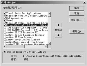 打開(kāi)VBA編輯器,從工具選單中選擇引用命令,選定Microsoft Excel 10.0對(duì)象庫(kù)并確定(見(jiàn)圖2)。