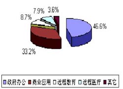 視頻會議系統(tǒng)在我國開始發(fā)展的初期,政府部門的應(yīng)用就占據(jù)了重要位置,覆蓋中央到直轄市和各省會城市的國家公眾視頻會議骨干網(wǎng)已經(jīng)完工。自1994年9月投入使用以來,國務(wù)院等機(jī)關(guān)先后利用該網(wǎng)召開了三百多次全國范圍的可視通訊會議。整個系統(tǒng)運(yùn)行情況良好,得到了國家領(lǐng)導(dǎo)人和各部委領(lǐng)導(dǎo)的高度贊揚(yáng)。近年來隨著電子政務(wù)工程的逐步推進(jìn),政府部門更加關(guān)注視頻會議系統(tǒng)建設(shè)。在經(jīng)濟(jì)發(fā)達(dá)地區(qū)(例如浙江、山東、廣東),視頻會議網(wǎng)已覆蓋到地市級城市,有的甚至覆蓋到縣一級。除各級政府之外,其它諸如檢察院、法院、公安和和水利等職能部門也是視頻會議系統(tǒng)的重要用戶。如圖1所示,政府辦公已占全部市場份額的46.6%。