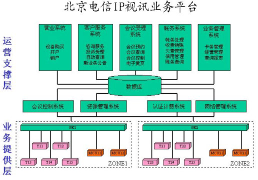 在整個運營支撐層的系統(tǒng)中,主要包括四大系統(tǒng),即會議控制系統(tǒng)、資源管理系統(tǒng)、認證計費系統(tǒng)、網(wǎng)絡管理系統(tǒng)。除此之外,還有其它幾個輔助系統(tǒng),包括營業(yè)系統(tǒng)負責為客戶開戶和銷戶,終端注冊等處理;客戶服務系統(tǒng)提供咨詢服務、投訴受理、自動查詢和幫助客戶進行會議預約,在資源不足的情況下進行會議調(diào)度等;會議受理系統(tǒng)是面向客戶提供會議電視業(yè)務預約、會議狀態(tài)查詢、會議控制服務,由用戶自助完成預約會議和控制會議的操作;賬務系統(tǒng)負責賬務方面的管理,包括賬務管理,收費銷賬,催繳欠費、銀行繳費等;業(yè)務管理系統(tǒng)主要是記賬卡的卡務處理、經(jīng)營管理、查詢報表等。
