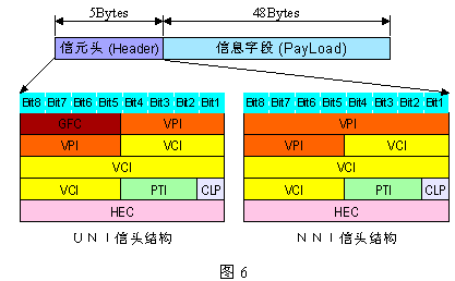 ATM信元實(shí)際上就是分組,為區(qū)分X.25分組(Packet)改稱為信元(Cell)。ATM信元具有固定的長(zhǎng)度,總長(zhǎng)為53字節(jié)。其中前5個(gè)字節(jié)為信頭(Header),包含各種控制信息,包括信元目的(邏輯)地址、糾錯(cuò)碼、業(yè)務(wù)控制和維護(hù)信息等;后面48字節(jié)為信息字段(Payload),又稱凈荷,其中包含了業(yè)務(wù)的數(shù)據(jù),它們將被透明地傳輸。信元結(jié)構(gòu)如下圖6所示。在UNI接口和NNI接口上ATM的信元頭結(jié)構(gòu)是不同的。