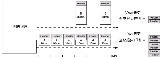 在一個減少發(fā)話方和受話方間音頻反應(yīng)時間的努力中,VoIP網(wǎng)關(guān)通常會配置成發(fā)送較小的語音數(shù)據(jù)載荷。雖然這樣做通常可以減少聽得見的傳輸延遲,但同時也增加了一個給定語音數(shù)據(jù)流需要傳遞的包的數(shù)量。因?yàn)椴还芏嘈〉囊纛l載荷都需要一個固定大小的包報(bào)頭,網(wǎng)上需要傳遞的數(shù)據(jù)量越大這個效果越明顯──跟隨的是網(wǎng)絡(luò)包和數(shù)據(jù)流量的相應(yīng)增長。圖1說明了用于傳輸包報(bào)頭的帶寬會隨著包載荷大小的縮小而增大。