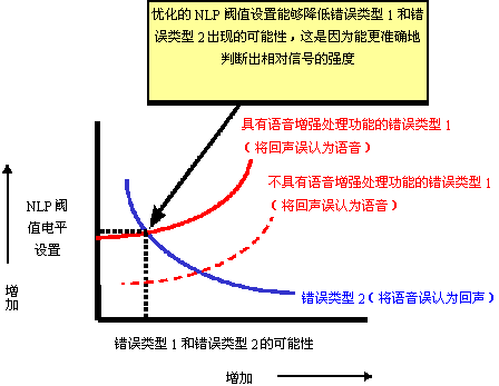 dB)能夠顯著降低將雙對(duì)話語(yǔ)音信號(hào)誤認(rèn)為聲學(xué)回聲信號(hào)的概率,從而防止了"錯(cuò)誤類型2"?傊,在"錯(cuò)誤類型1"(實(shí)線曲線,具有語(yǔ)音增強(qiáng)特性)和"錯(cuò)誤類型2"曲線的交叉點(diǎn)上,通過(guò)與之對(duì)應(yīng)的NLP設(shè)置,可以獲得最佳的性能(請(qǐng)參見(jiàn)圖10)。