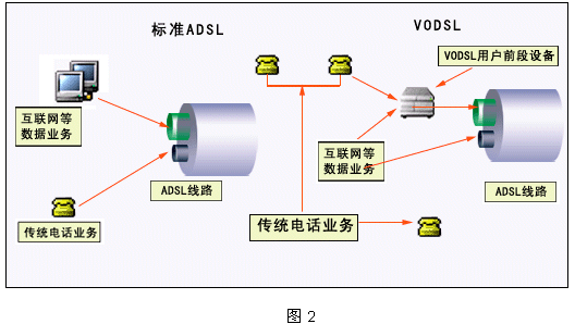 VoDSL技術,就是利用xDSL技術在一對傳統(tǒng)電話用戶線上,維持原有電話業(yè)務的同時,提供高速數(shù)據(jù)業(yè)務(如互聯(lián)網(wǎng)業(yè)務)和多個額外電話業(yè)務。利用VoDSL技術,業(yè)務提供商在無需增添新的數(shù)據(jù)網(wǎng)絡或硬件線路就可以為用戶提供高速的數(shù)據(jù)接入和更多的電話線路數(shù)及其他增值業(yè)務,從而減少運營成本,擴大了利潤空間。下圖2的左邊給出了電話運營商采用ADSL技術的基本配置,右邊則給出了VoDSL應用。