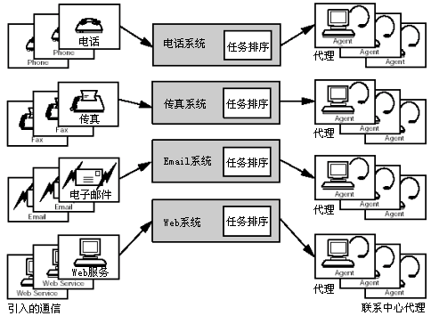 對(duì)通信媒體多樣性的支持是非常重要的,其中通信媒體包括電話、交互語(yǔ)音應(yīng)答、email、Web業(yè)務(wù)、傳真以及文件處理。為了處理通信媒體的多樣性,系統(tǒng)可能被分成多個(gè)子系統(tǒng),每個(gè)子系統(tǒng)對(duì)應(yīng)一種媒體類型。子系統(tǒng)將輸入的通信信息通知給負(fù)載序列,并且一直保留該通信信息,直到收到負(fù)載序列準(zhǔn)備路由該通信信息的消息。然后子系統(tǒng)按照負(fù)載序列的指令將通信信息發(fā)送到正確的代理坐席或設(shè)備。