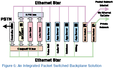 PICMG 2.16兼容平臺(tái)上,這種解決方案充分利用了有背板結(jié)構(gòu)的以太網(wǎng)交換的集成特性,以提供任意插槽(節(jié)點(diǎn))和以太網(wǎng)交換插槽兩者之間的物理連接。有著特定的串行卡,可能是語音處理卡,SDSL集中器,或一塊VoIP網(wǎng)關(guān)卡,通過使用在這些卡上的CompactPCI控制平面和H.110數(shù)據(jù)平面得以實(shí)現(xiàn)。(為了清晰,額外的不被使用的CompactPCI總線部分,和相關(guān)的H.110總線部分,在圖6中忽略)