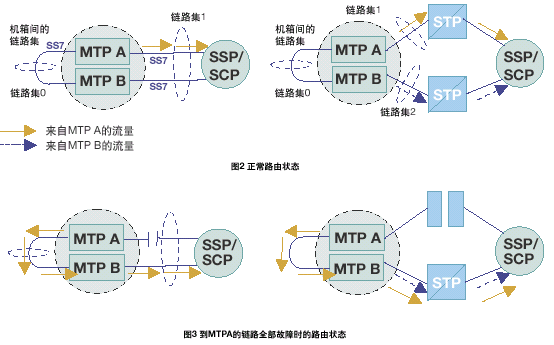 當(dāng)連接到MTP A或連接到 MTP B的所有鏈路均發(fā)生故障時(shí),訊息通過(guò)MTP A和MTP