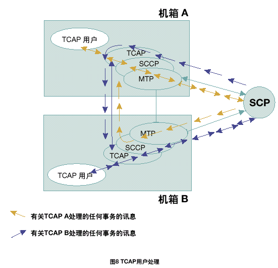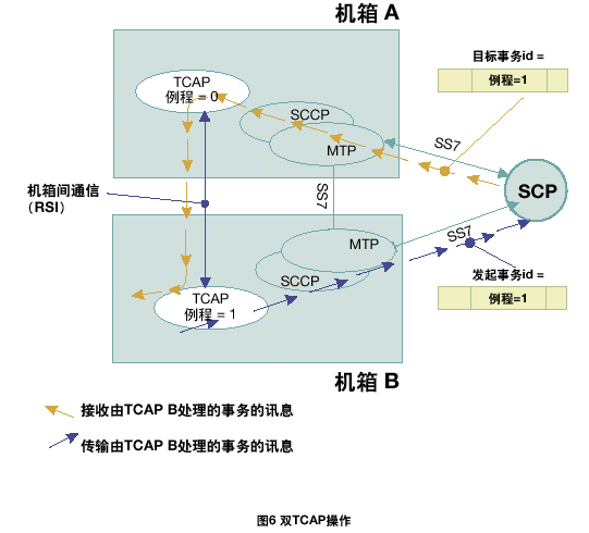 每個(gè)TCAP將所有接收的信息傳遞到同機(jī)箱中的TCAP用戶任務(wù)中。根據(jù)每一個(gè)TCAP中不同的應(yīng)用層或用戶,將TCAP層的本地應(yīng)用程序發(fā)送的傳送會(huì)話和組件原語(yǔ)傳遞給正確的TCAP。在雙系統(tǒng)環(huán)境中,接收訊息可以在任何MTP和SCCP層上共享;因此,一個(gè)TCAP層接收由其它TCAP處理的應(yīng)用在激活事務(wù)上的TCAP訊息是可能的。