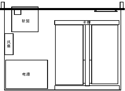 DSC110由若干水平插在卡槽兩側(cè)的板卡構(gòu)成,卡槽固定在機(jī)箱的底部的后側(cè)。冷卻扇、硬盤、電源、軟盤驅(qū)動(dòng)器和前端面板顯示卡都固定在機(jī)箱上。