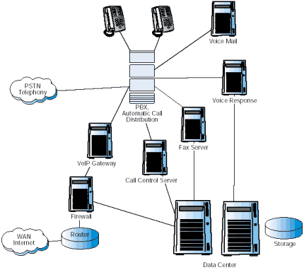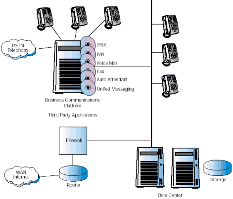 傳統(tǒng)的企業(yè)通信系統(tǒng)通常如下建立:以一個PBX或KTS為核心,加上附屬的媒體服務(wù)器。其中媒體服務(wù)器支持各種應(yīng)用,比如說語音郵件和交互式語音應(yīng)答(IVR,interactive