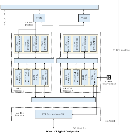 D/320-JCT板卡通過與外部網(wǎng)絡連接的CT總線接口與網(wǎng)絡接口板卡相連。DSP資源通過一個CT612模塊接收數(shù)字語音數(shù)據(jù),CT612作為到CT總線的接口。DSP基于下載到它的高速RAM中的Spring