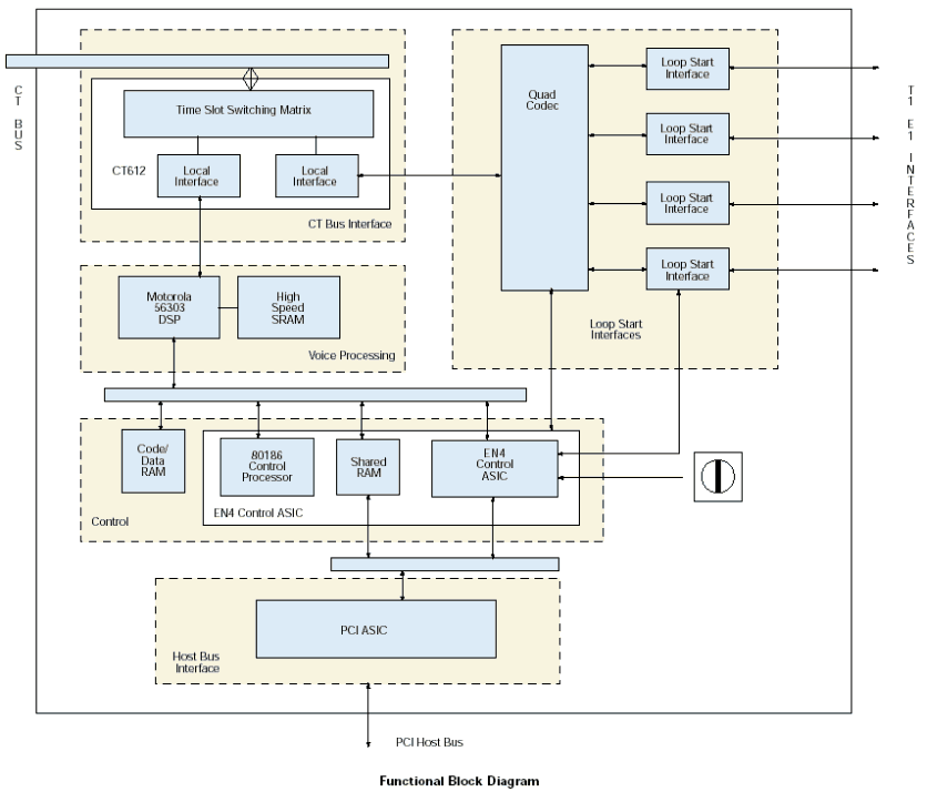 使用VFX/41JCT-LS板卡和CT總線時(shí),來自網(wǎng)絡(luò)板卡或其他資源的數(shù)字語音和資源通過H.100接頭和CT總線接口進(jìn)入板卡。由一個(gè)CT612芯片管理這些信號,并且作為通道協(xié)調(diào)器和矩陣交換機(jī)來緩存來自總線的高速信號數(shù)據(jù),直到每個(gè)通道的數(shù)據(jù)發(fā)送到DSP。