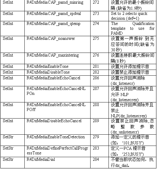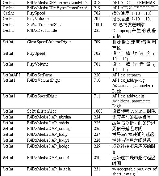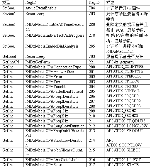 必須注意,調用API級的函數(shù)設置一個CTADE_A參數(shù)可能不只改變電路板級的參數(shù)。例如,R4DxMedia中,使用函數(shù)MediaSetBool設置REGID_R4DxMediaDisableAllToneDetection(280)為0或1來清除Dialogic提示音ID。