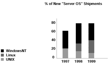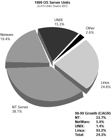 而且,在1999年Linux服務(wù)器增長率大約在98.3%,遠遠超過居于第二位的Windows的24%的增長率。