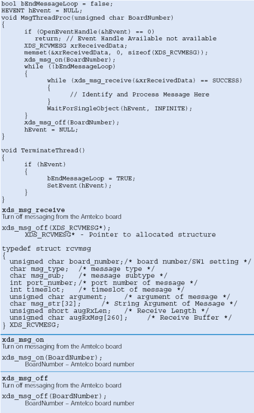 缺省情況下Amtelco卡不向應用發(fā)送消息,應用必須調用sdx_msg_on函數(shù)請求消息發(fā)送。當用應用停止后,需要sdx_msg_off函數(shù)停止發(fā)送消息。(注意:如果運行多個應用監(jiān)控板上消息,確信必須是最后一個應用調用sdx_msg_off函數(shù))