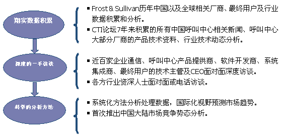 Frost & Sullivan 和 CTI論壇(m.xanxdzkj.com)共同組成的調(diào)研小組,在查閱了大量資料的基礎(chǔ)之上,以企業(yè)通信及呼叫中心的設(shè)備應(yīng)用、投資計(jì)劃以及相關(guān)廠商的市場表現(xiàn)為出發(fā)點(diǎn),通過對(duì)企業(yè)通信及呼叫中心重要應(yīng)用企業(yè)、在市場占主導(dǎo)地位的二十多家設(shè)備廠商、二十多家軟件開發(fā)商、十幾家系統(tǒng)集成商、數(shù)家外包運(yùn)營商的深度訪談,參閱內(nèi)部相關(guān)報(bào)告及數(shù)據(jù)庫,對(duì)數(shù)據(jù)的來源和數(shù)據(jù)的準(zhǔn)確性進(jìn)行了詳細(xì)核對(duì)與論證;憑借參與調(diào)研人員的多年從業(yè)經(jīng)