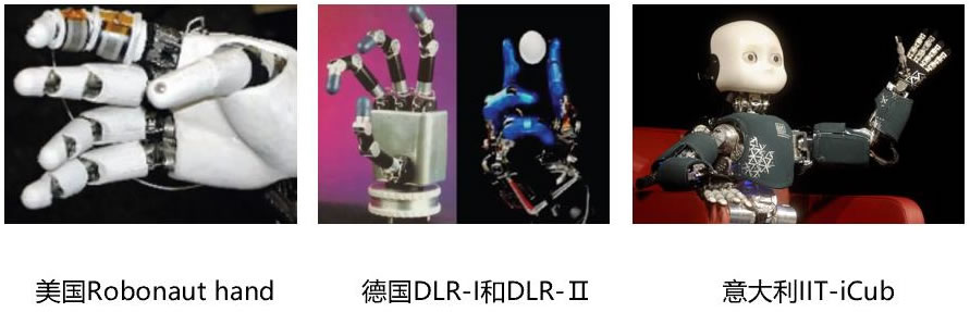 2) 德國宇航中心先后研制成功了 DLR-Ⅰ和 DLR-Ⅱ靈巧手,共集成了 25 個傳感器, 包括類似人工皮膚的觸覺傳感器、關(guān)節(jié)扭矩傳感器、位置傳感器和溫度傳感器 等,靈巧手在靈活性和感知能力方面有顯著提升。
